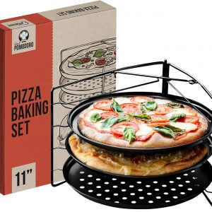 Chef Pomodoro Pizza Baking Set with 3 Pizza Pans and Pizza Rack, (11-Inch Pans), Non-stick Perforated Pizza Trays for Oven, Grill, Pizza Pan with Holes, Pizza Pan for Oven
