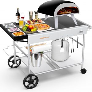 Pizza Oven Table Grill Cart with Pizza Topping Station Movable Food and Prep Workcart Outdoor Grill Table Stand for Ninja Woodfire Blackstone Griddle Cuisinart