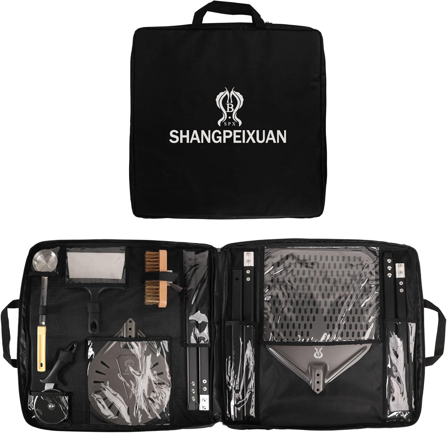 - Ideal for light-duty use in your foodservice establishment, this kit includes a 12” x 14″aluminum rectangular pizza peel, an 9″ aluminum round Turning pizza peel, a 32″ adjustable swivel brass bristle brush, and a 3.7inch pizza cutter,a 6.4inch food knife,a 3oz Sauce spoon.