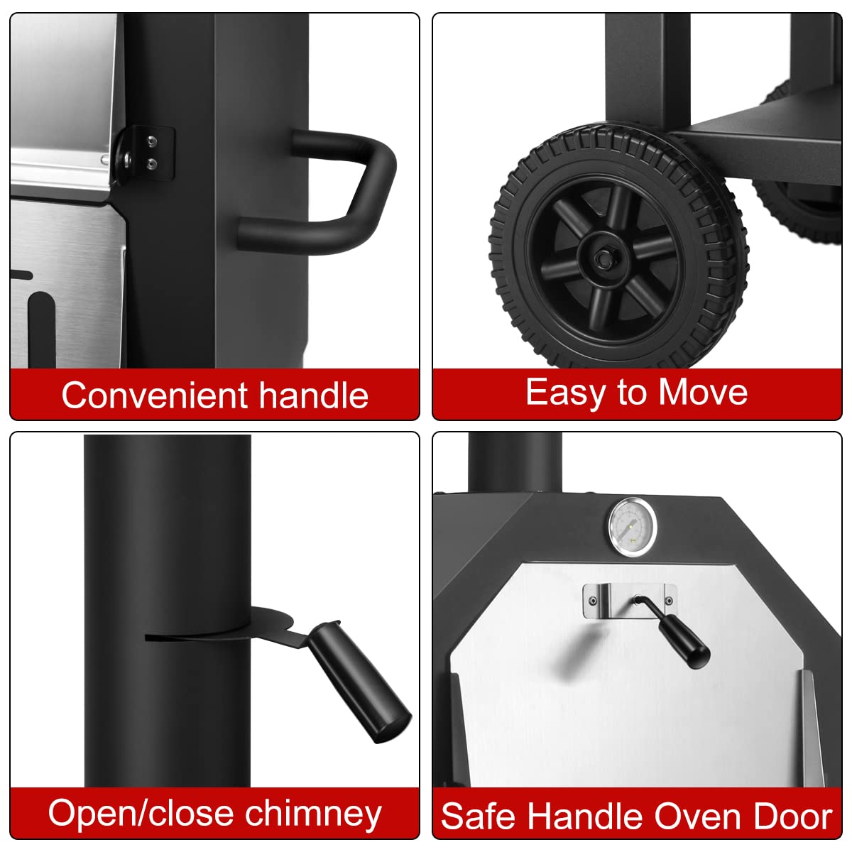 - 【Practical Design】There is a detachable storage space for carbon ash, which is convenient for you to remove carbon ash. Easy to move with 2 large wheels and a side handle. An open shelf under the oven where you can store wood.