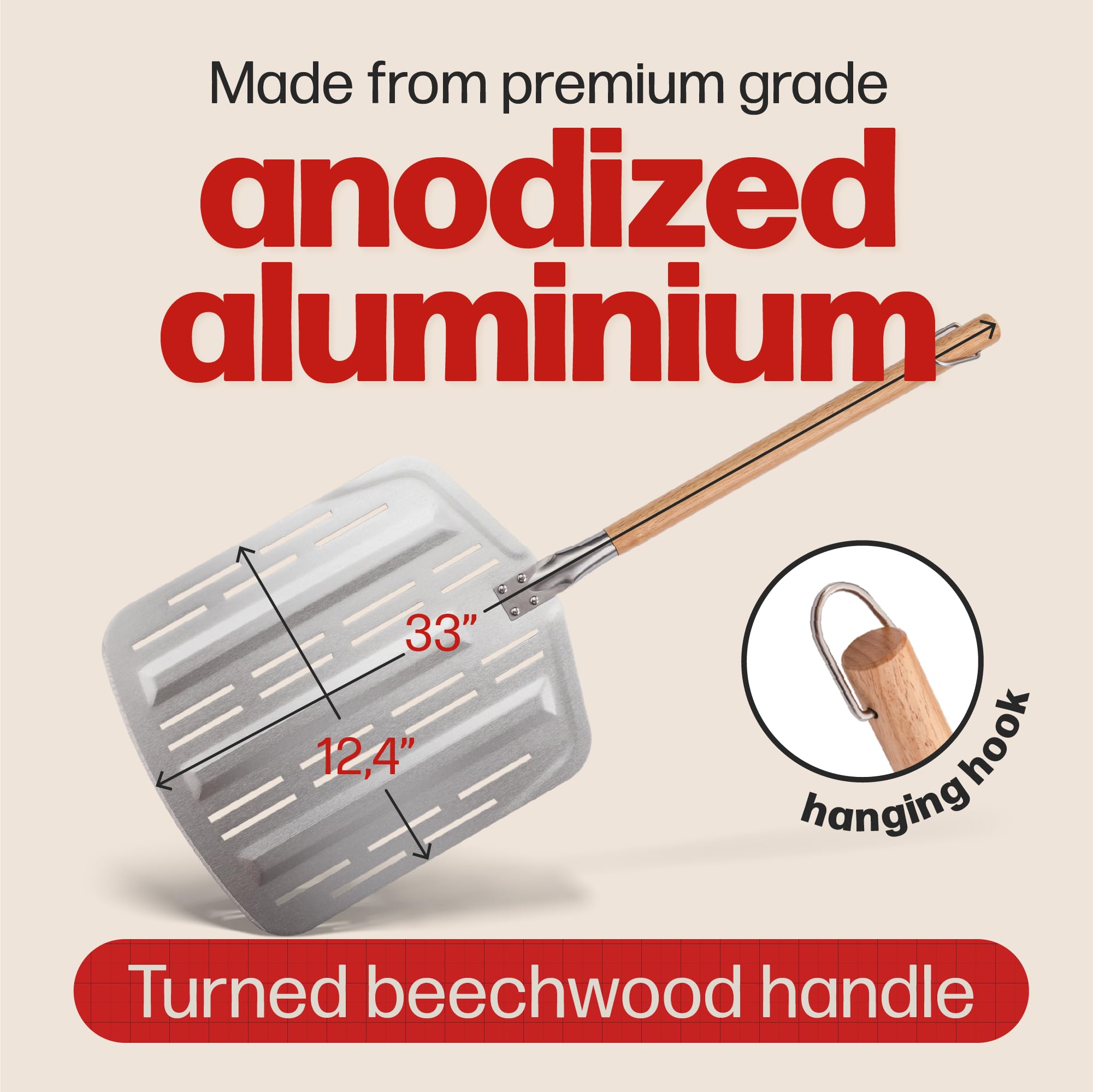 - PREMIUM QUALITY: Made from premium grade Anodised Aluminium, with a turned beechwood handle for comfortable and safe handling. Our pizza peels are made to last, meaning you can launch and retrieve delicious home made pizzas again and again.