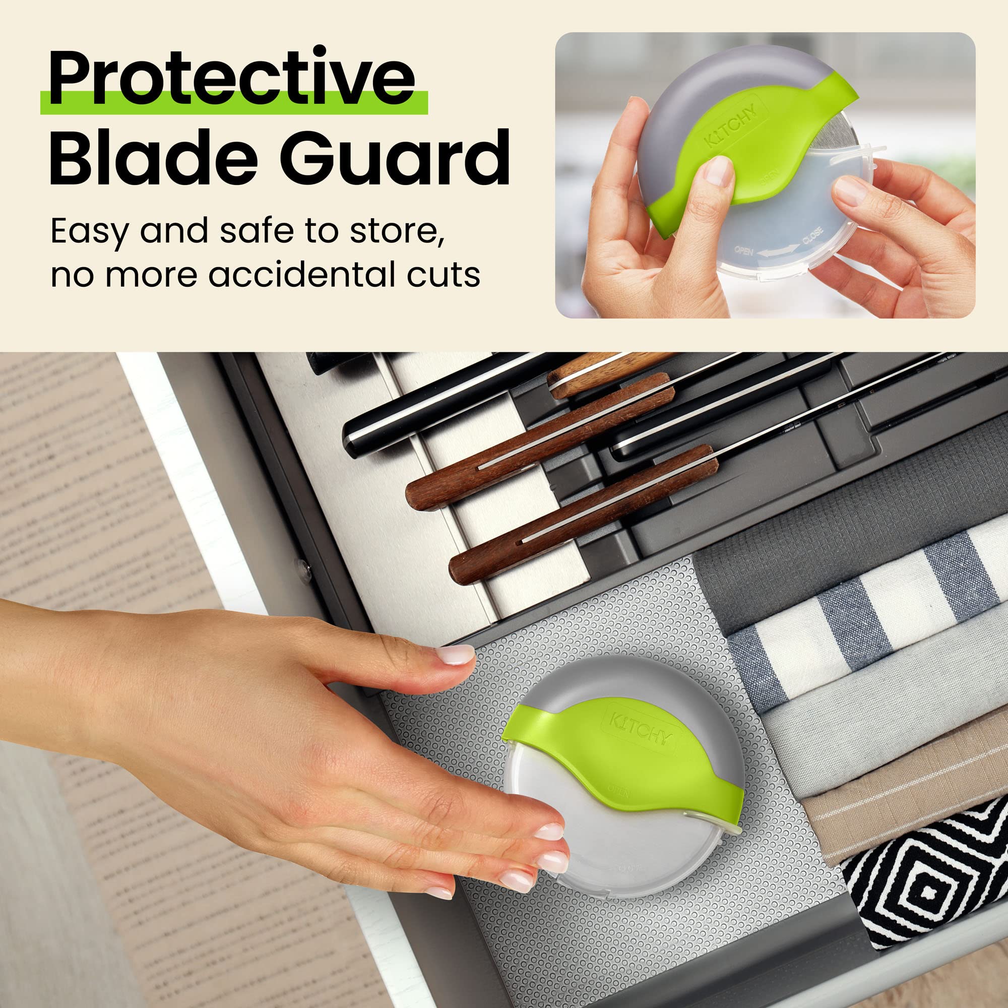 - PROTECTIVE BLADE GUARD FOR EASY STORAGE – This pizza cutter wheel comes with a blade guard to keep your cutter securely stored away when you’re not using it.