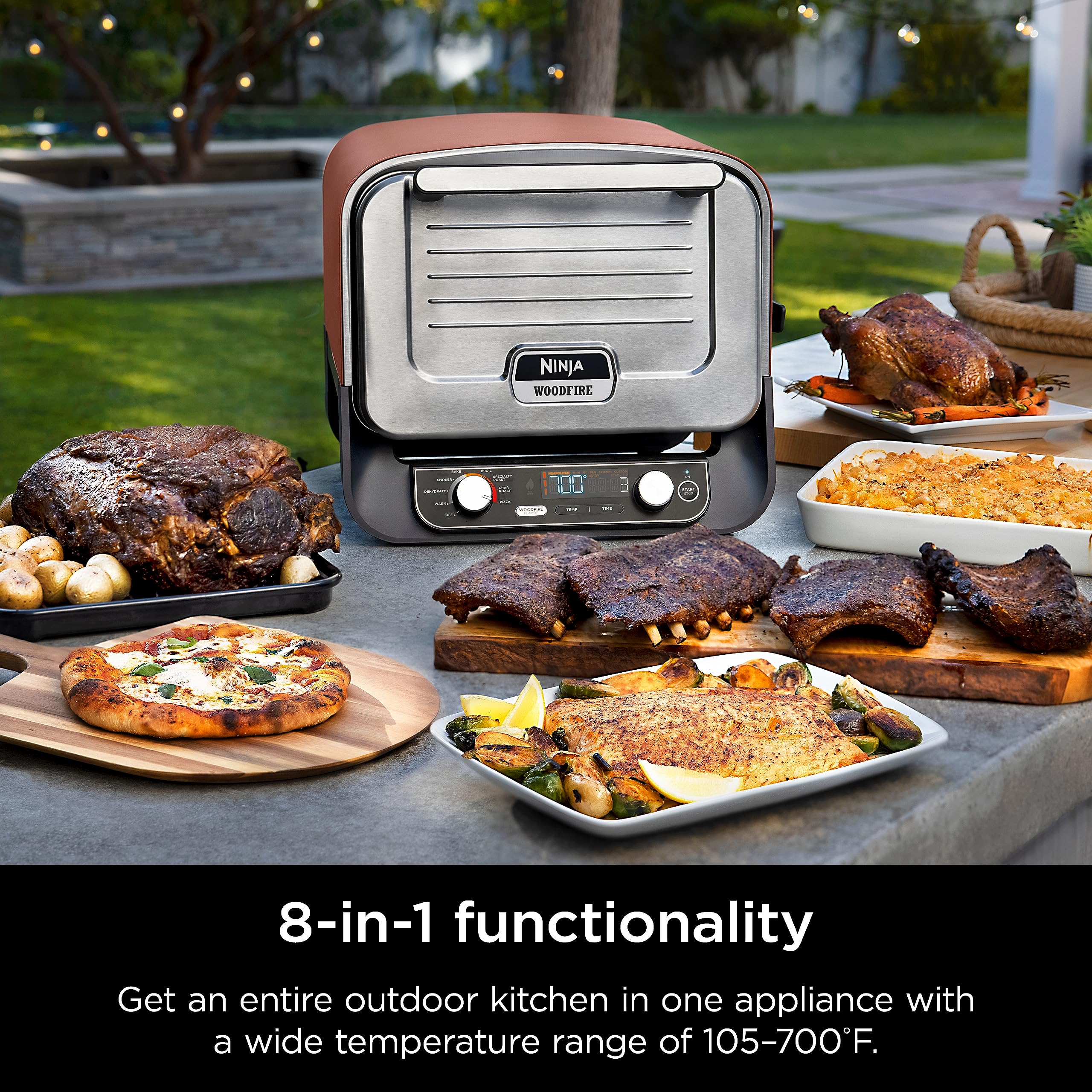 Details: Reimagine what you can cook outdoors with the Ninja Woodfire Outdoor Oven. This electric outdoor oven unlocks 8-in-1 versatility with a wide temperature range of 105-700°F for a world of premium flavors, textures, and results at the touch of a button. Plus, add authentic woodfire flavor to anything you make at any temperature with just 1/2 cup of pellets with Woodfire Technology.