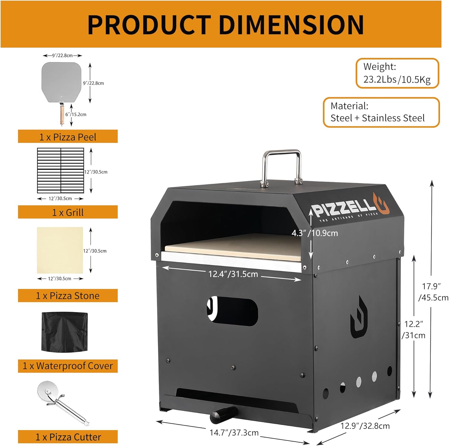 - Perfect Gift for Family – Pizzello wood fired pizza oven kit comes with 1 x 12″ Grill Pizza Oven, 1 x Fire Pit, 1 x Stainless Steel Pizza Peel, 1 x12″ Pizza Stone, 1 x Waterproof Cover to prevent dust, 1x Ash Tray for collect and easy removal of ash. Easy to assemble and quick to start making mouth-watering dishes for your loved ones. Makes the perfect thanksgiving gifts for family – Every family deserves great pizzas!