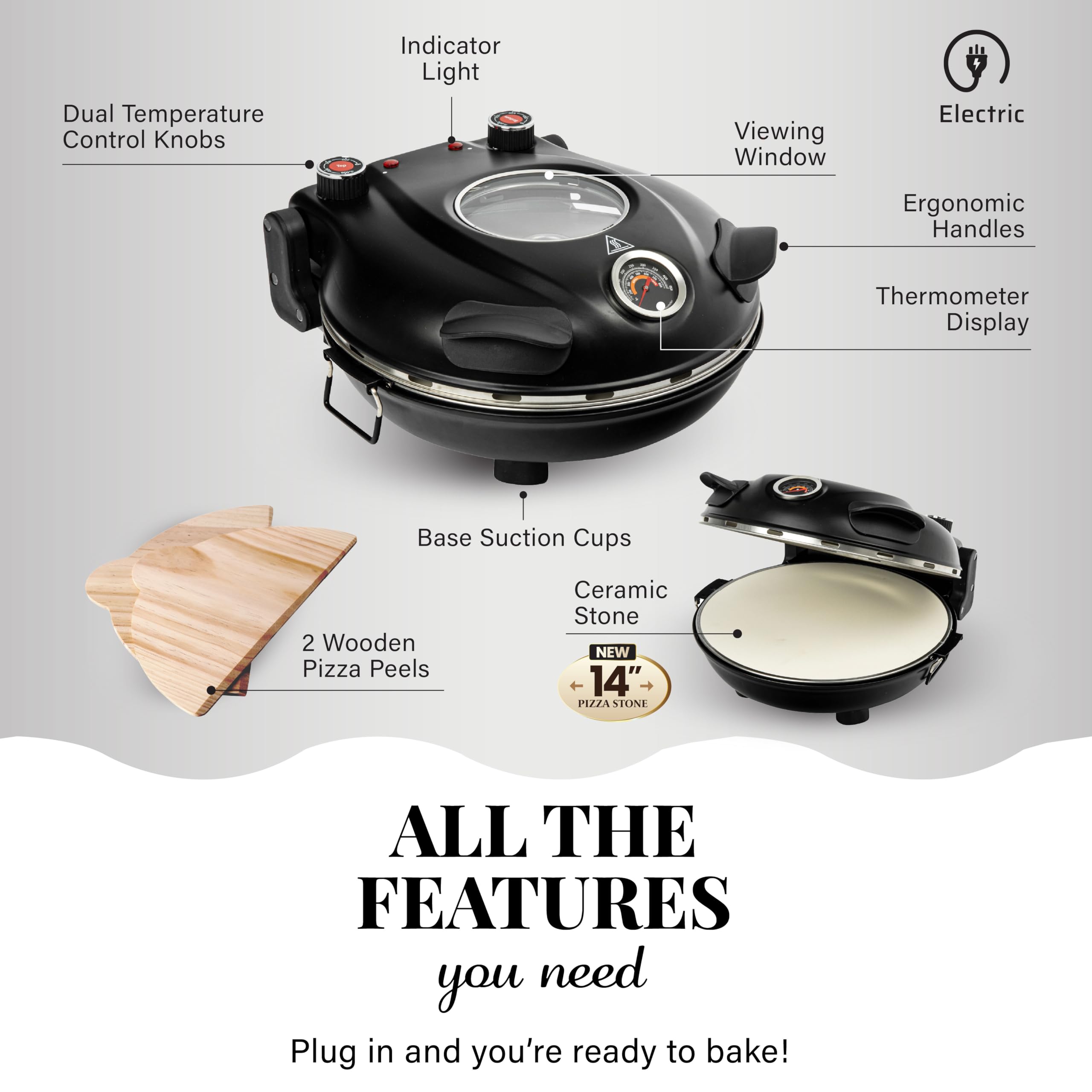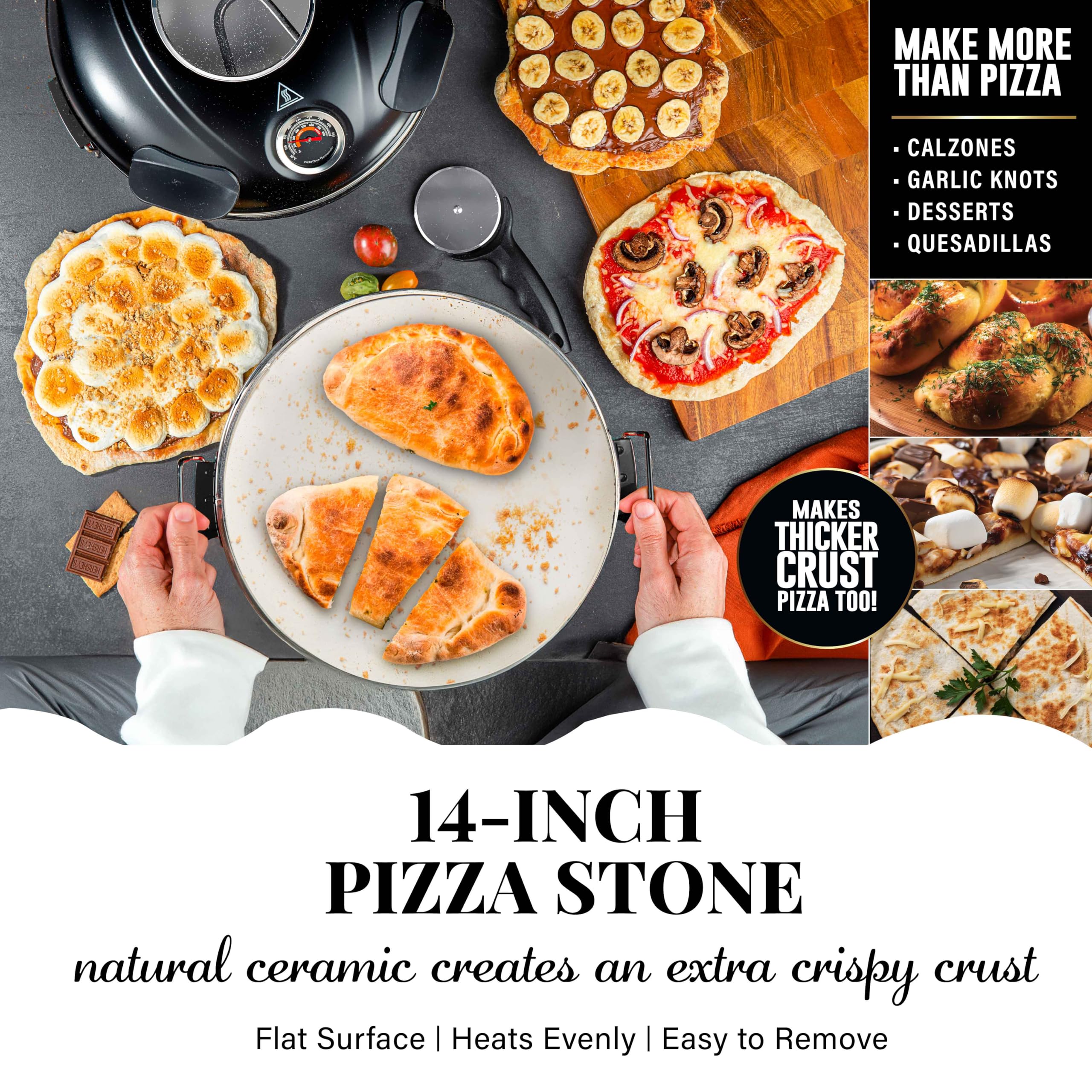 - STONE-BAKED PIES: A flat 14” pizza oven stone made of natural ceramic transfers heat while cooking so your pizza bakes evenly, resulting in a crispy crust. Once done, the stone is removable for easy cleaning. horno pizza