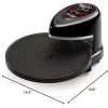 The fast and easy way to bake frozen, homemade, take-and-bake, and deli pizza. Also great for preparing frozen convenience foods such as chicken nuggets, jalape–o poppers, fish fillets, egg rolls, cinnamon rolls, cookies and much more. Rotating tray turns continuously to assure even baking. Top and bottom heating elements bake foods from both sides. Heating elements are separately controlled, allowing you to select top, bottom, or both elements for perfect results every time. Timer signals end of cooking time and automatically turns off heating elements. Save as much as 60% in energy compared to a conventional oven. Nonstick pan is removable for easy cleanup and storage. 120 volts AC, 6o Hz only, 1235 watts