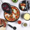 This 1,235-watt countertop oven makes pizza in about half the time required by a conventional oven. You don’t need to preheat it–it begins rotating and baking the moment you plug it in. There are independently controlled top and bottom heating elements, so all types (frozen or fresh) and sizes (7 to 12 inches) of pizza can be custom baked. With a rising-crust pizza, for example, you should run the lower heating element for 10-12 minutes before turning on the top element. For a crisper crust, bake the pizza with both heating elements, then finish it off with a few minutes of bottom-only heating. For extra cooking time on your toppings, leave the top element on a little longer. A timer with automatic shutoff lets you set cooking times precisely, and a cooking-time guide for various pizza types is printed on the pizza maker. For safety, the appliance shuts off automatically if it overheats. With the 13-1/4-inch-diameter baking pan in place, the pizza maker is 13-1/4 inches wide, 9-1/2 inches high, and 17-1/2 inches deep. (The baking pan can be removed for more compact storage.) It carries a two-year warranty against defects. –Fred Brack