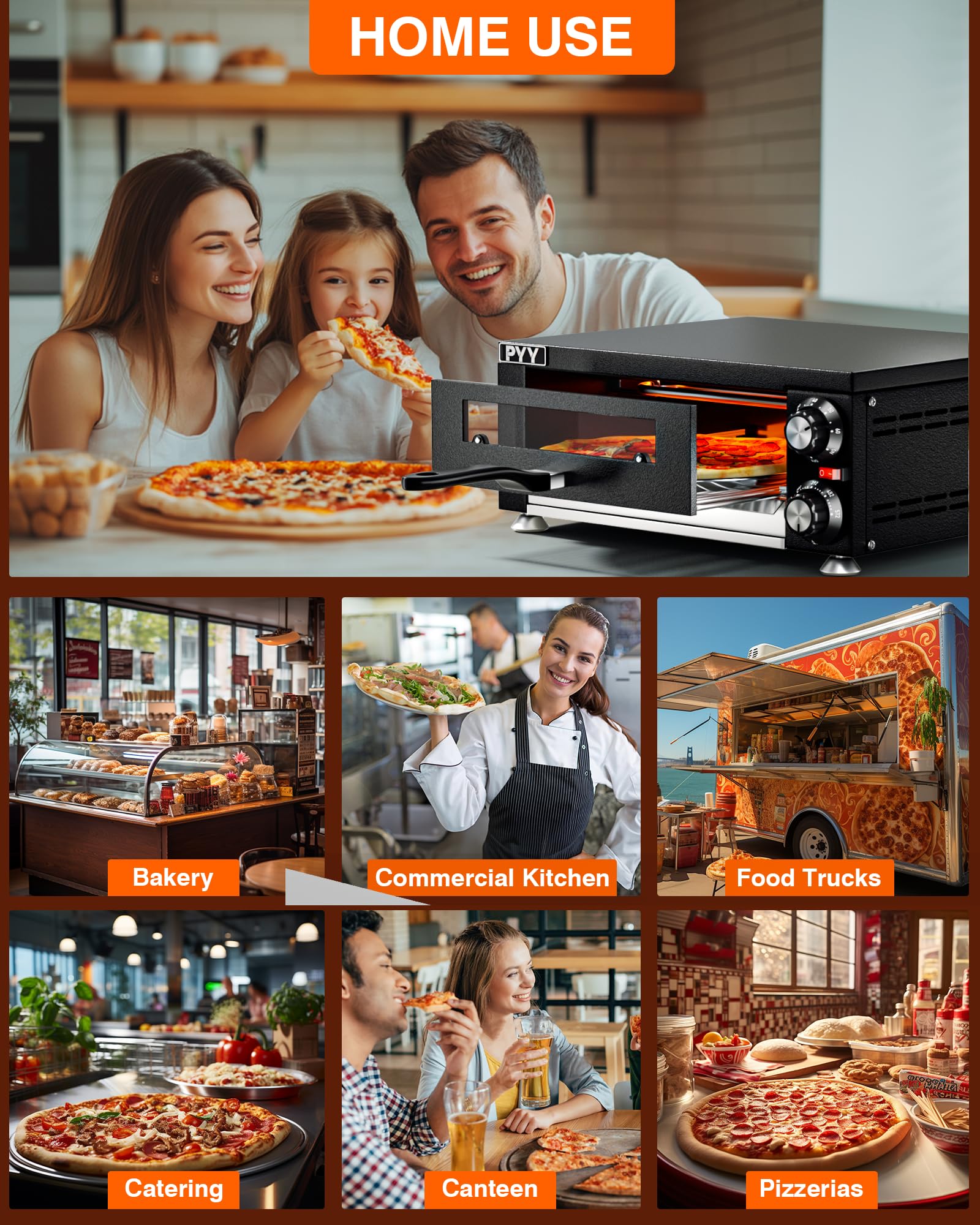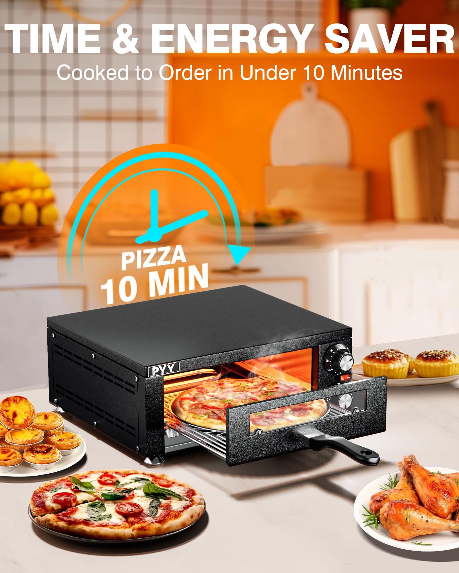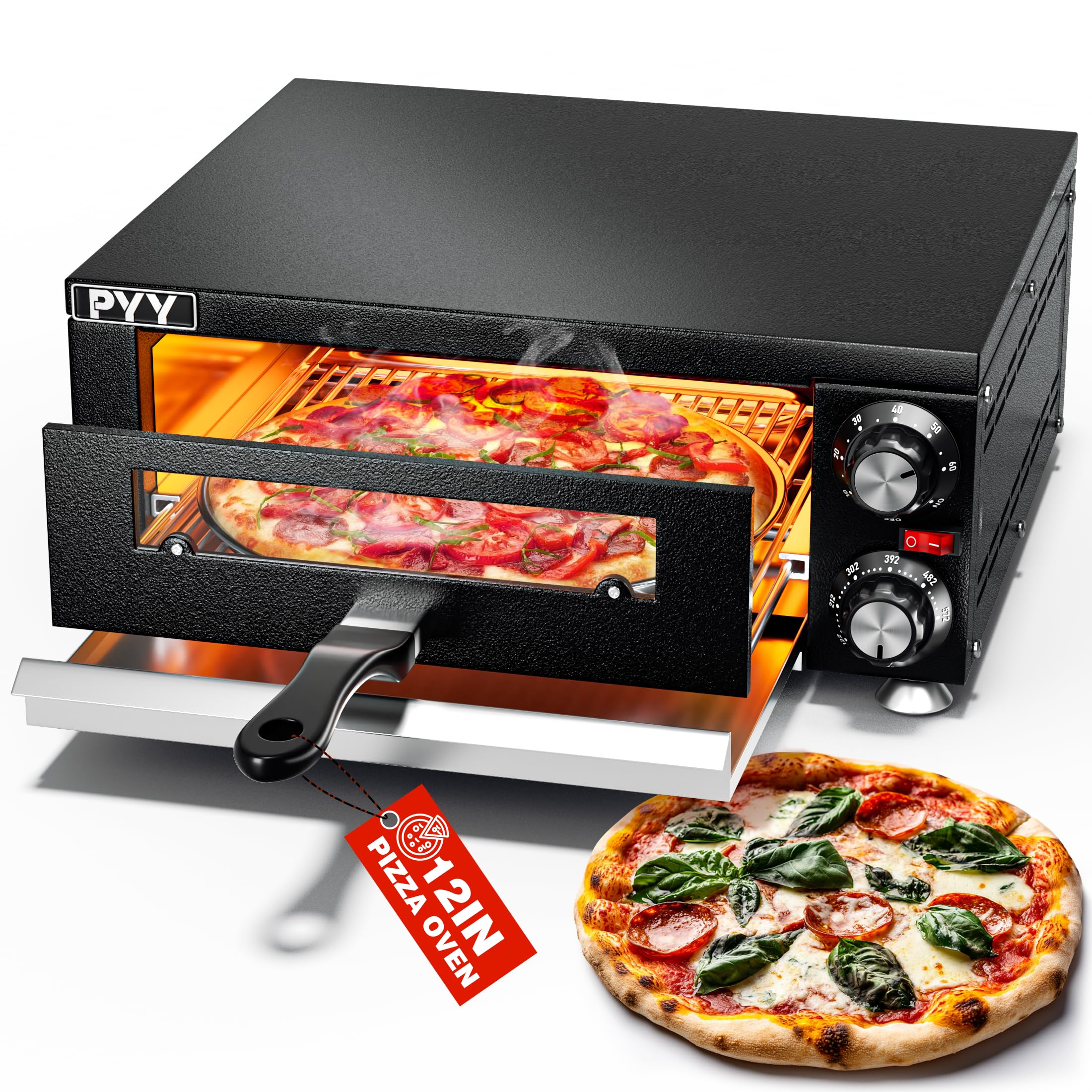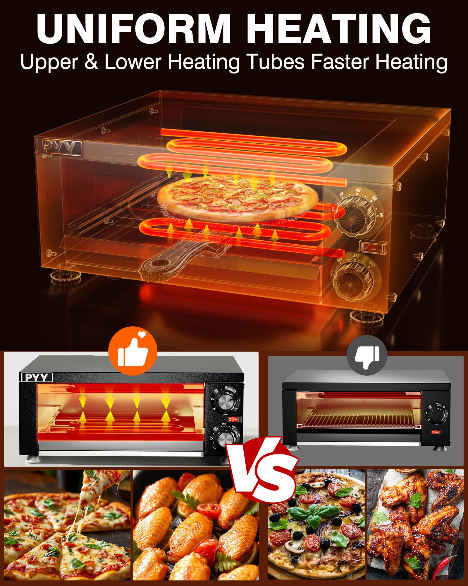 - UNIFORM HEATING – With the design of upper and lower heating tubes of PYY pizza ovens for indoors, pizza can be heated evenly and has even color and luster when out of oven.
