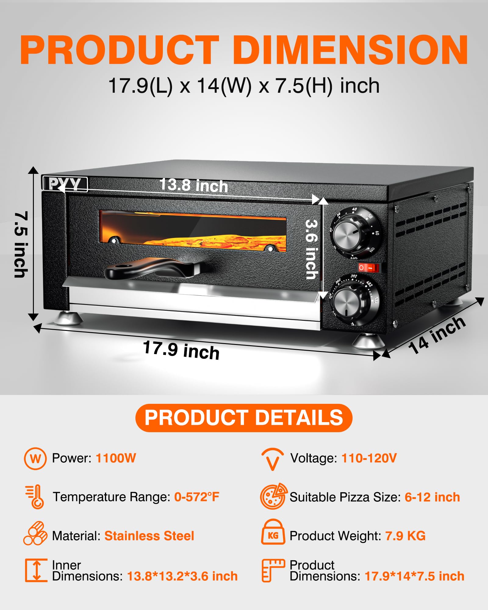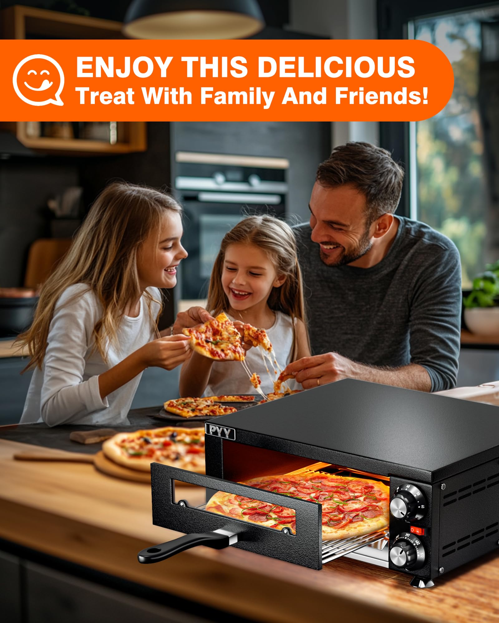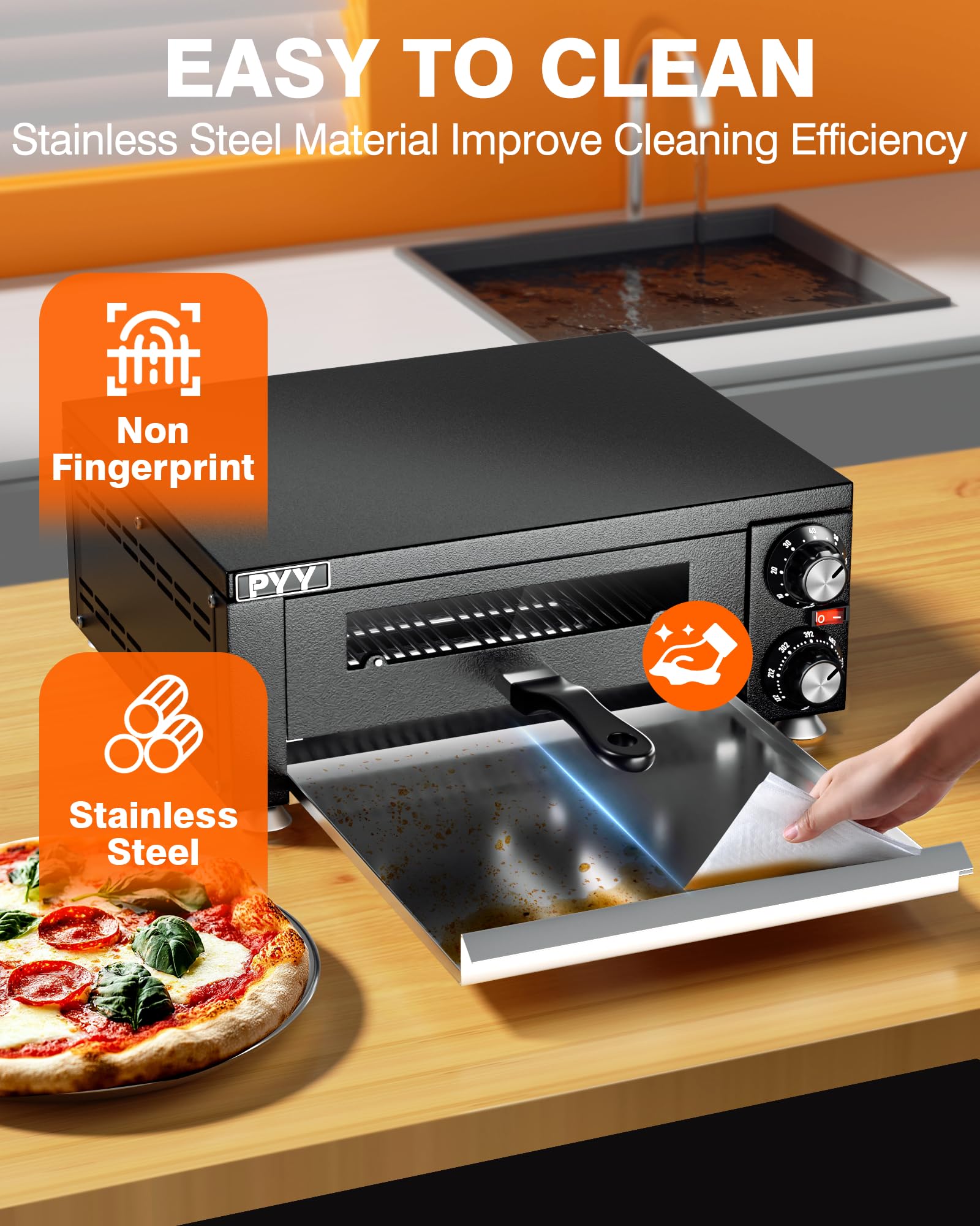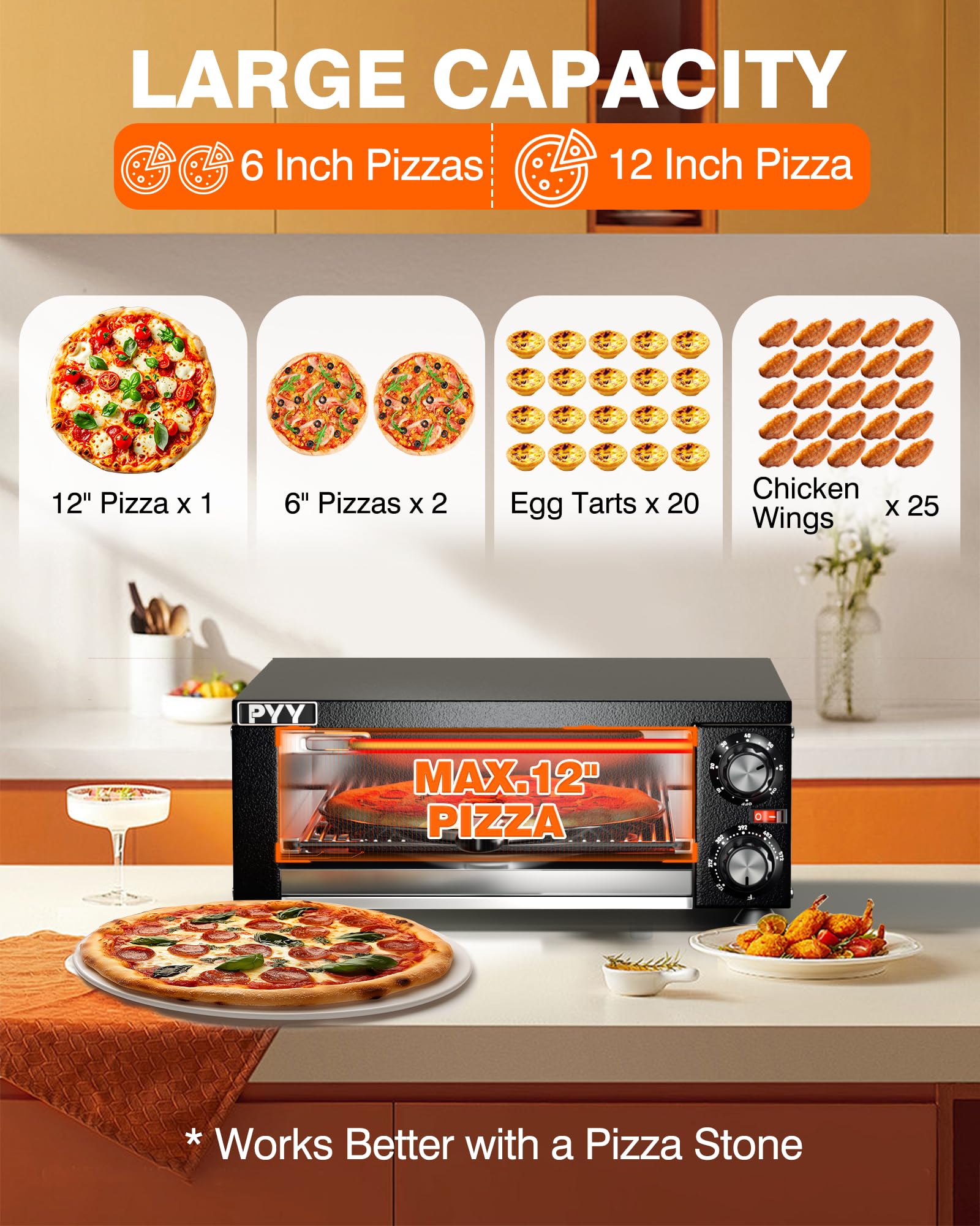 - UNIFORM HEATING – With the design of upper and lower heating tubes of PYY pizza ovens for indoors, pizza can be heated evenly and has even color and luster when out of oven.